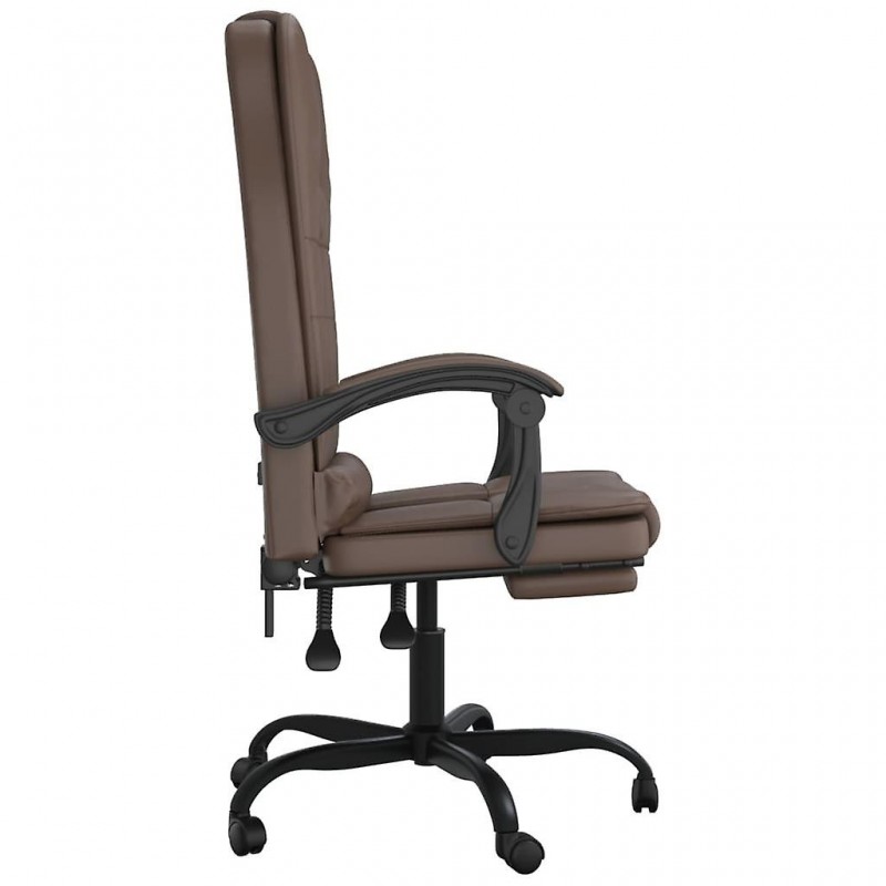 Farbe: Braun. Material: Kunstleder (75 % Polyvinylchlorid, 5 % Baumwolle, 20 % Polyester), Metall, Sperrholz. Füllung: Schaumstoff. Gesamtmaße: 63 x 56 x (112,5-122) cm (Breite x Tiefe x Höhe). Maße liegend: 63 x 128,5 x (100-109,5) cm (Breite x Tiefe x Höhe). Sitzfläche: 51 x 44 cm (Breite x Tiefe). Sitzhöhe vom Boden: 46,5–56 cm. Armlehnenhöhe vom Boden: 67,5–77 cm. Eingangsspannung: DC 5 V. Eingangsstrom: 2A.