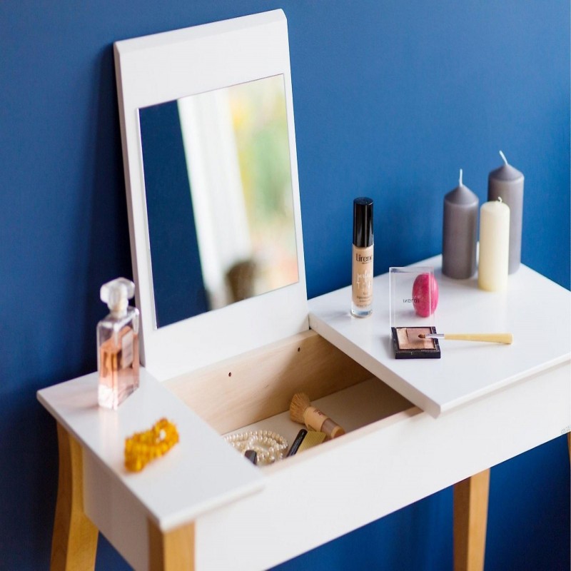 Der Frisiertisch ist aus Buchenholz und laminiertem und lackiertem MDF gefertigt. Dies macht es nicht nur zu einem formschönen Möbelstück, sondern auch zu einem langlebigen Produkt. Die farbenfrohen Beine sind in einem stilvollen Schwarz gehalten und die Tischplatte ist 19 mm dick, was ihr ein robustes und solides Aussehen verleiht.