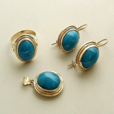 Goldring, Ohrringe und Anhänger mit türkischen Perlen.